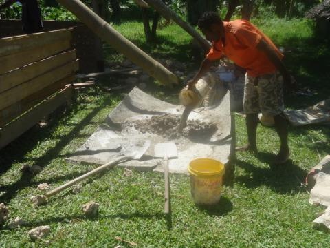 Mixing cement for my half bamboo, half concrete walls