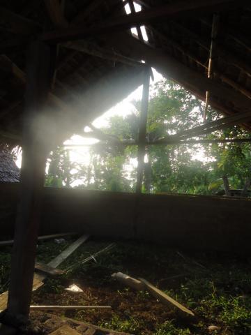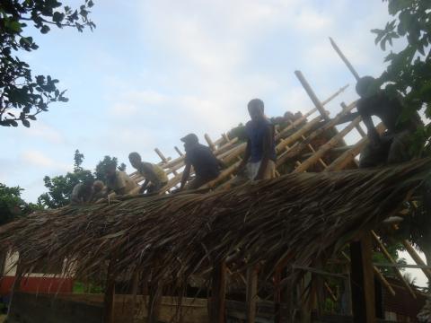 The finished kitchen. To tie each piece of roof up, we went further up the hill to gather the inside "rope" of long branches grown out of certain trees.